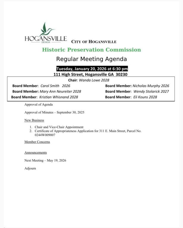 The Historic Preservation Commission will hold a meeting on Tuesday, January 20, 2026 at 6:30pm at Hogansville City Hall, 111 High Street, Hogansville, GA 30230. The meeting is open to the public and all are welcome to attend.